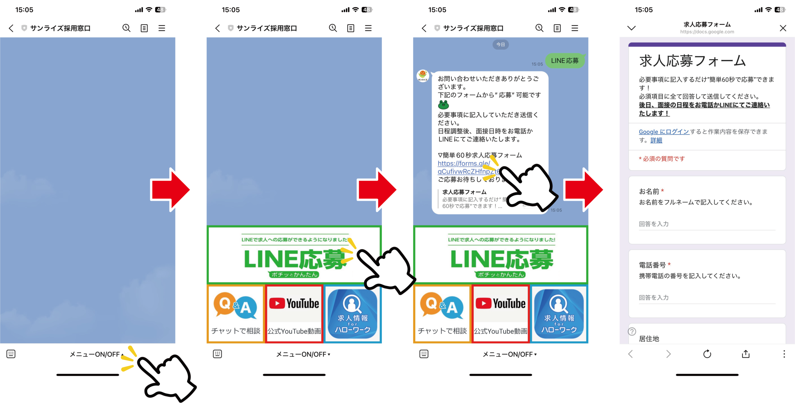 公式LINEを友だち追加し、「LINE応募」から求人応募フォームへ進みます。